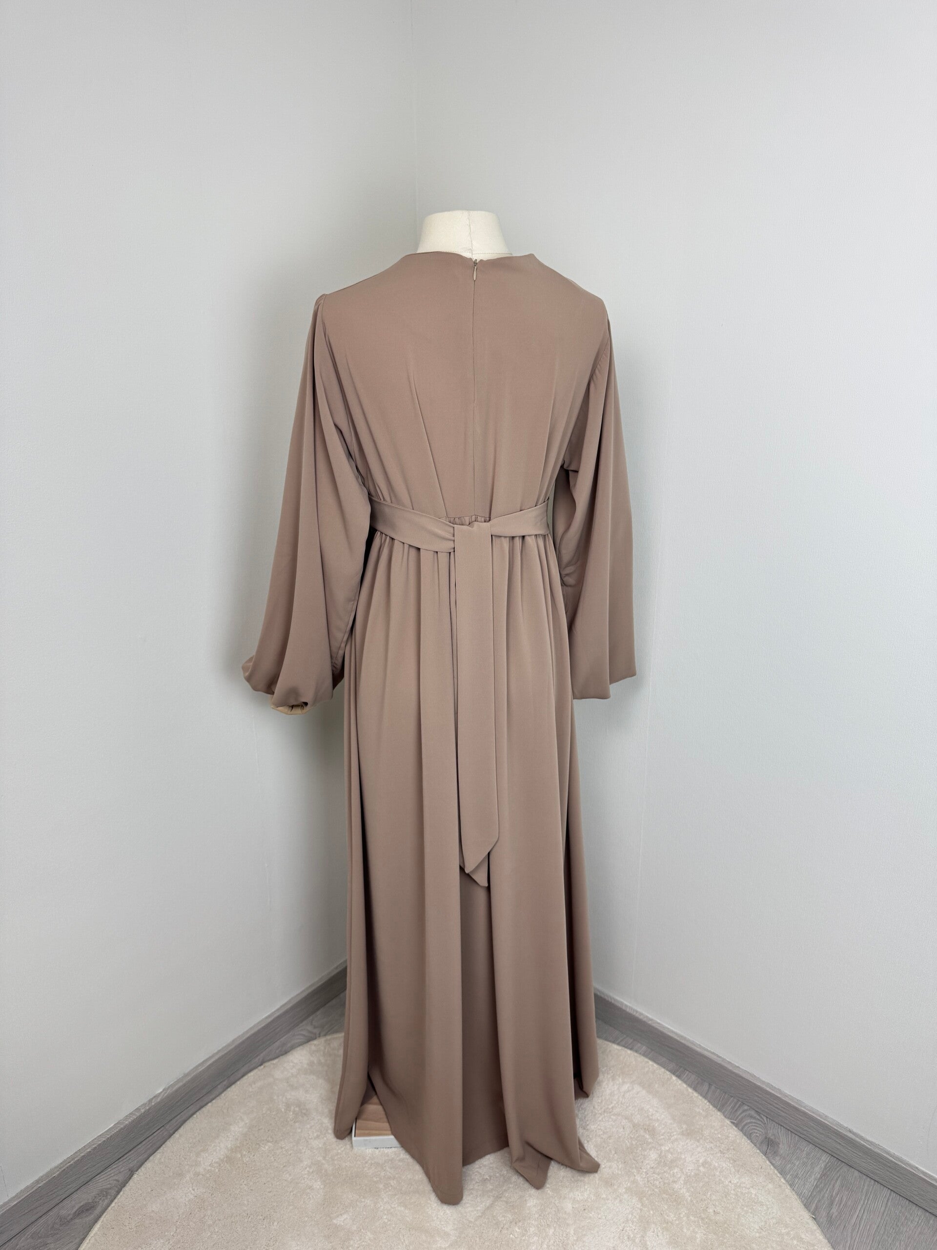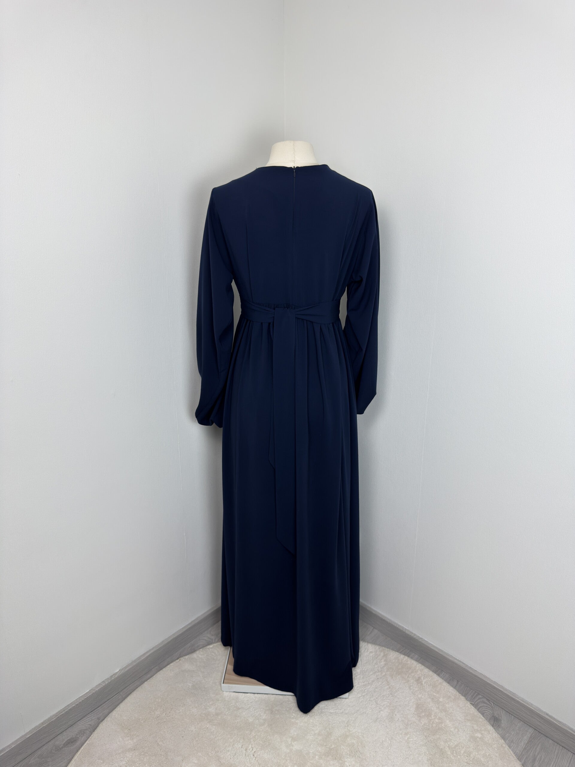 ● Detay: Ürünün kendi kumaşından seyyar kemeri mevcuttur, arkası fermuarlı, kolları lastikli, ürün boyu 145 cm